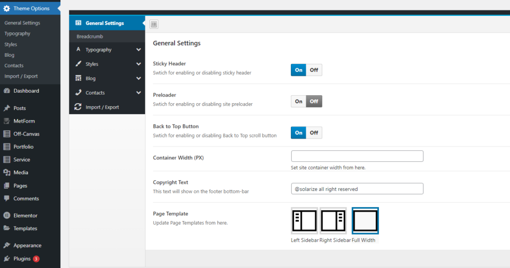 Theme RequirementsTheme InstallationRequired PluginsImporting Demo ContentTheme Options [3]General SectionsTypographyGeneral StyleElementor [1]How to add new widgetSet Default Home PageEdit Header & FooterTroubleshoot [2] [2]Demo import Failed404 Error in all pages Home / Documentation / Solarize WP Theme Documentation / Theme OptionsGeneral SectionsIn the General section, you can do the below thingsEnable Sticky HeaderEnable Preloader Show Back to Top ButtonEnable Dark ModeSet Container SizeSet Default Copyright textDoc navigation Typography >