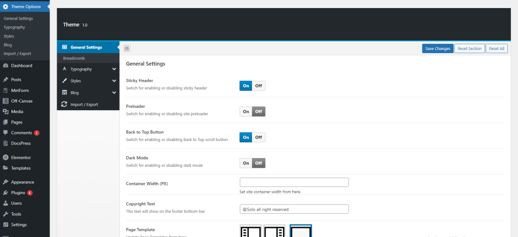 Theme RequirementsTheme InstallationRequired PluginsImporting Demo ContentTheme Options [3]General SectionsTypographyGeneral StyleElementor [1]How to add new widgetSet Default Home PageEdit Header & FooterTroubleshoot [2] [2]Demo import Failed404 Error in all pagesContact Home / Documentation / Solo WP Theme Documentation / Theme OptionsGeneral SectionsIn the General section, you can do the below thingsEnable Sticky HeaderEnable Preloader Show Back to Top ButtonEnable Dark ModeSet Container SizeSet Default Copyright textDoc navigation Typography >